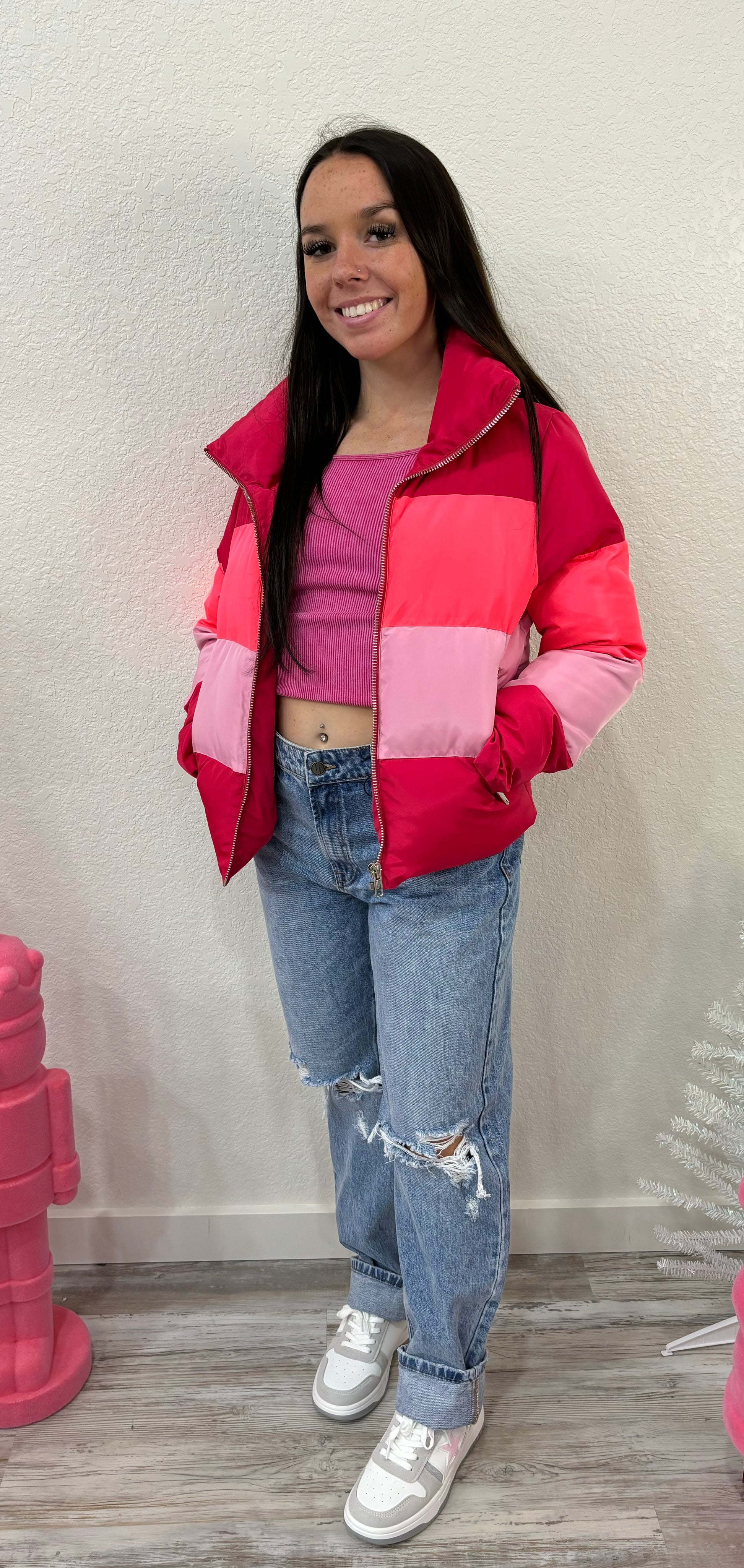 Puffer Jackets don't get more stylish than this! The Addison is the perfect addition to your winter coat collection! She features a zip up and snap closure, a color-block design, and two side pockets! Pair her with leggings, bodysuit, and sneakers for a cute on-the-go look! Product Details: Fit: The Addison Jacket fits true to size. Length: The small measures 23.5" from shoulder to hem. Bust: Accommodating to most bust sizes. Waist: Relaxed fit Fabric: Fabric does not contain stretch. Material: 100% Polyester