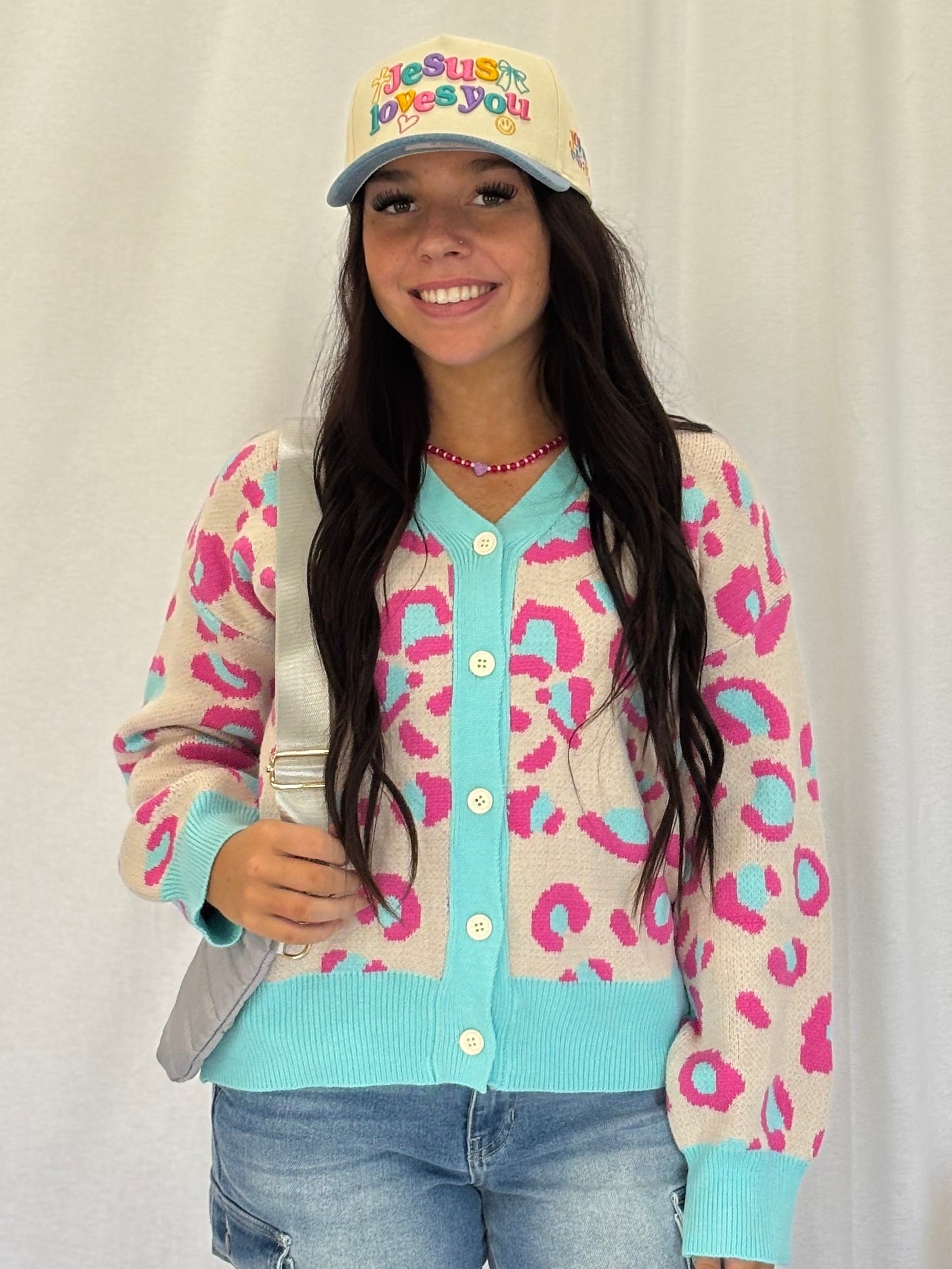 Cozy meets colorful in our Miley Cardigan! This playful piece features a bold pink and turquoise leopard print against a cream backdrop, finished with aqua blue ribbed trim and buttons for the perfect pop of contrast. With its relaxed fit and lightweight knit, it’s the ultimate layering piece to keep you comfy while standing out in style. Pair it with jeans, cargos, or even a cute skirt for an effortlessly fun look.