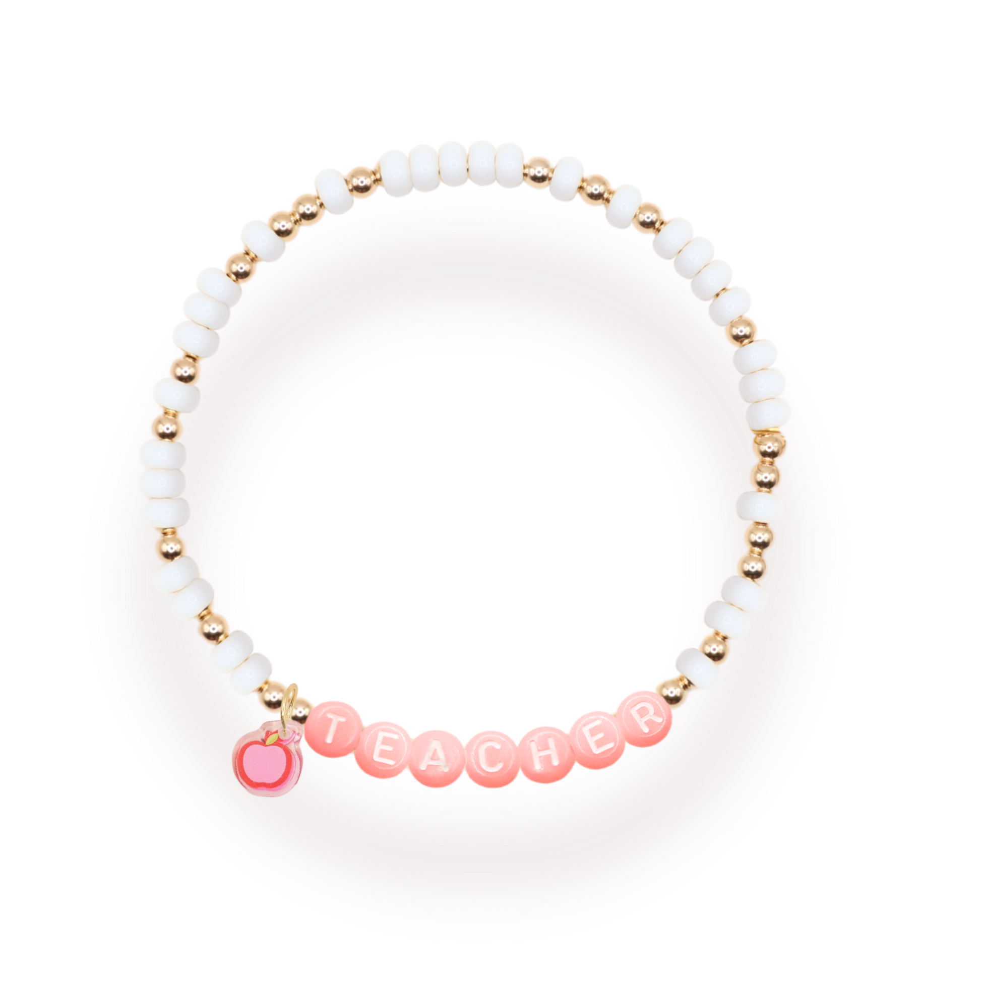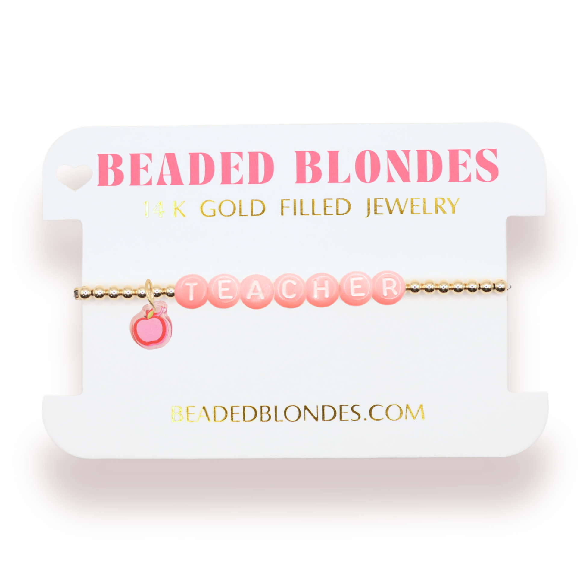 Material: 14 K gold filled beads, an acrylic letter bead and durable elastic string so perfect for everyday wear! Sweat proof, water proof and tarnish free!